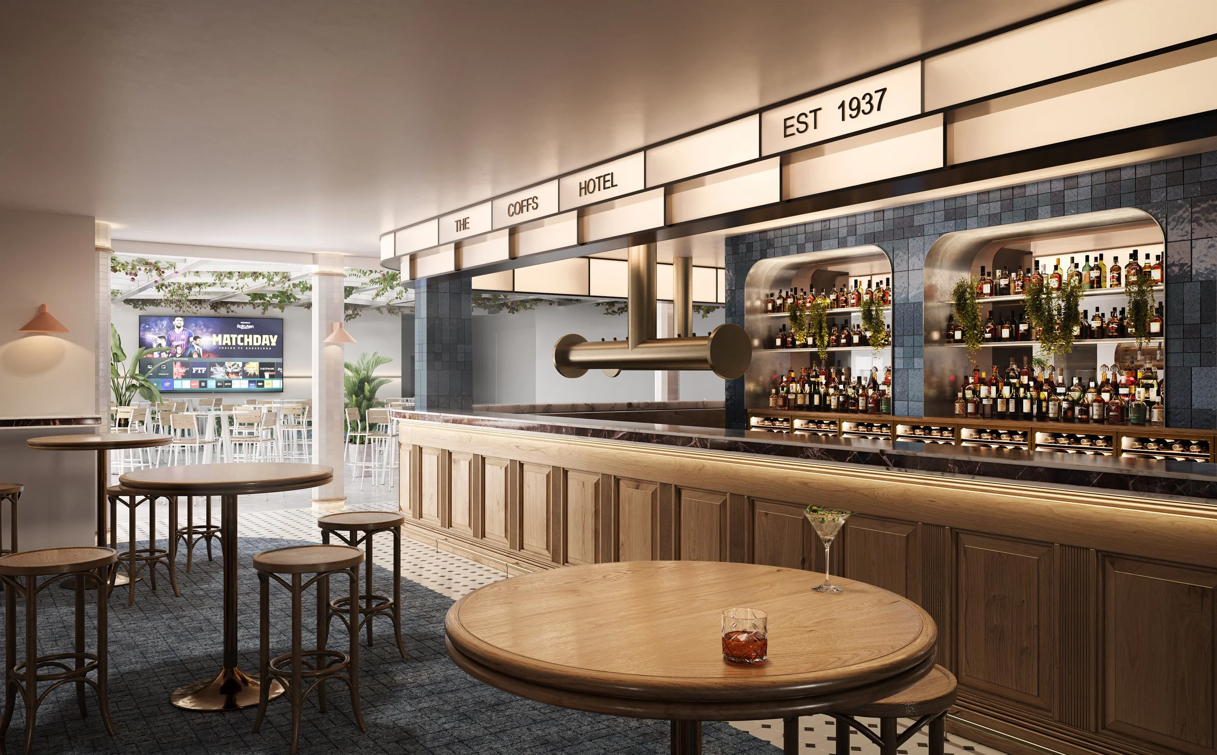 In regional areas, the charm and intimacy of small bars are often missing, with larger venues dominating the landscape. Fabric Architecture aimed to fill this gap by incorporating elements that evoke the cozy and celebratory atmosphere found in city small bars. The cocktail bar at Kincumber Hotel offers guests an intimate experience within the larger venue, providing a perfect balance of glamour and casual beach style that encompasses the main venue. The design of the cocktail bar is a testament to thoughtful architecture and attention to detail. The use of moody lighting and warm honey tones creates an inviting ambiance, while ocean blue tiles and wave furniture motifs add a touch of the coastal charm that reflects the local environment. These elements work together to create a space that feels both unique and familiar. The cocktail bar's design pays homage to traditional Aussie pubs, but with a modern twist. The full tiled bar mirrors the classic shape of a pub bar, yet with an innovative flip. What would typically serve as a footrest is now transformed into the shape of the bar top, adding an unexpected and contemporary touch to the space.